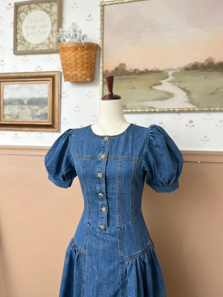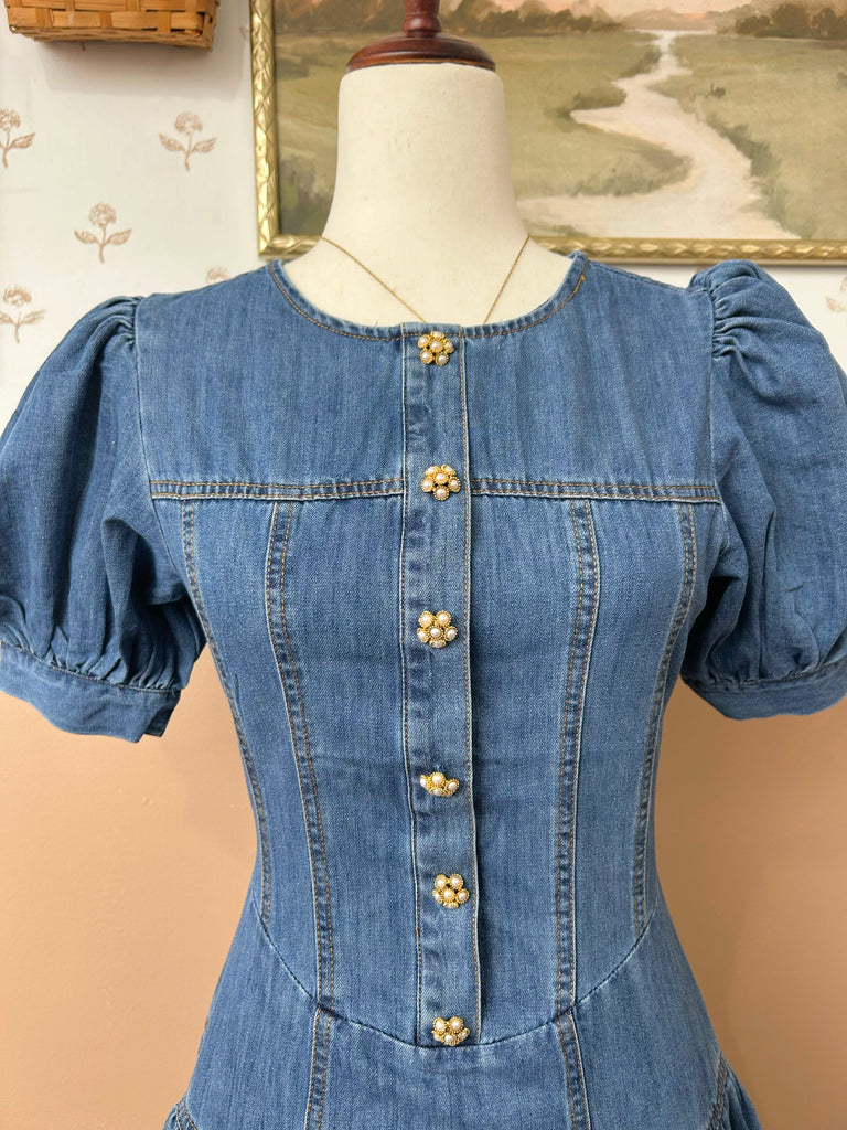 Effortless charm meets timeless style with this washed denim midi dress. Designed with a classic round neckline and delicate short puff sleeves, it features decorative jewel buttons down the front and flattering side shirring that shapes the silhouette. The full, flowing skirt offers comfortable movement, while the back zipper closure ensures an easy fit.
